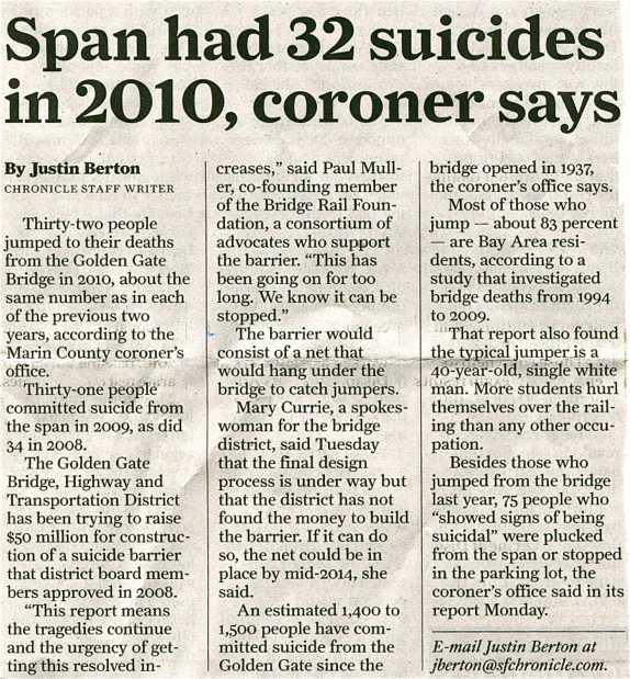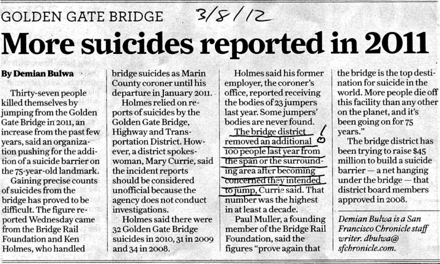 What is most astounding about this article are the “100 people removed from the span over concern they intended to jump.” That means that nearly 140 people went to the Golden Gate Bridge in 2011 with a serious thought of suicide, 37 succeeded. Put another way, every 2-3 days on average someone went to the bridge to die.