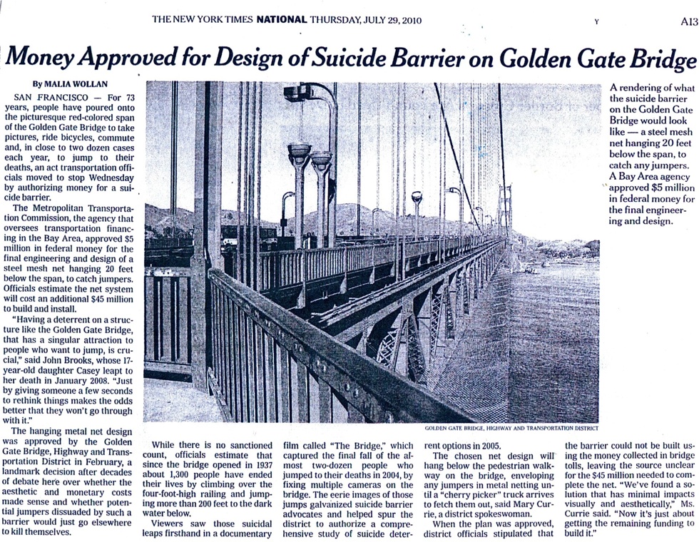 Spend mental health funds elsewhere. There are vocal “anti-barrier advocates” – none mental heath experts – whose basic assertion is (1) suicide barriers don’t work because there is no conclusive, indisputable proof that barriers directly lead to overall declines in suicide and (2) why single out the Golden Gate Bridge over other suicide magnets. Therefore, mental health dollars would be better spent on treatment before people come to the end of their rope. First of all, our proposal does not borrow from mental health funds, but rather from highway funds. So we risk, perhaps, side-lining a paving project rather than mental health care. But to the broader issue, these advocates are technically correct – a direct, indisputable correlation cannot be proven. But that’s not the point. There have been numerous studies (described below) and substantial circumstantial evidence from other suicide barriers that suggest that barriers can be effective in lowering suicide rates. Often cases are made based on circumstantial evidence in lieu of hard facts; somewhat like trying to prove global warming based solely on the ice melt at Mt. Kilimanjaro. As to why the Golden Gate Bridge vs. other “preventable” suicide methods, the Golden Gate Bridge is simply well known as a source of death for decades. It’s obvious and in our faces. Tall buildings (also suicide magnets) very often have fences and locked access for obvious safety reasons. Same with dangerous stretches of freeway. Another Bay Area opponent, a retired psychologist who is now a sculptor, asserts that “there is no other site in the U.S. that saves as many people from suicide because I don’t think there’s any place where people get identified as suicidal as they do on this bridge.” He refers to the people saved – which is good – but ignores the people who continue to die. A minor hole in his thesis.