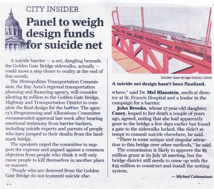 Today the Golden Gate Bridge district board of directors voted unanimously for a $76 million funding package from local, state and federal sources for the suicide barrier. It was widely reported in the media. It is estimated that the project could be shovel ready by the beginning of 2015 and take about 3 years to complete. It was a good day but my enthusiasm is somewhat muted because of the fact that construction projects like there are notorious for delays and cost overruns. I think a more realistic time fram is at least 5 years. In my testimony to the board I recommended at least a temporary safety mesh during construction, as was done in the 1930s when the bridge was built. It’d be a cruel iroy to continue to lose lives as efforts are taken to save them.