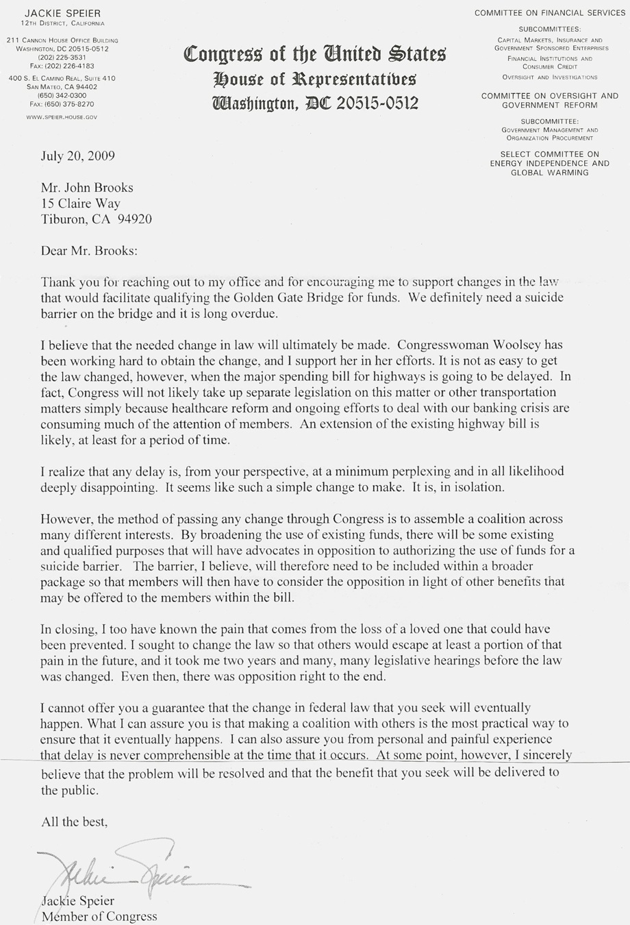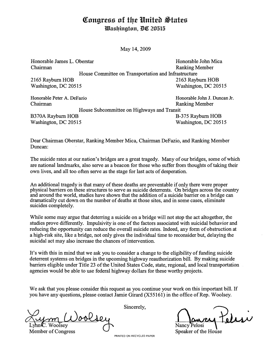 Since January, 2009, an alliance of concerned citizens - including people who’ve lost loved ones to the bridge, the mental health community, GGB Board staff and representatives from State Assemblyman Tom Ammiano’s office, have been working together on a funding strategy. The strategy is simple in concept: amend the language in the U.S. Highway Bill to allow for funding of “suicide deterrent systems” on bridge structures in the U.S. so that we can apply for funding under the Bill. Congresswoman Lynn Woolsey (D-CA) has undertaken to sponsor this proposed amendment (see below). Co-signing the bill were our great Congressional representatives from Northern California: Nancy Pelosi, Ellen Tauscher, Barbara Lee, Jackie Speier, Mike Thompson, Anna Eshoo, Mike Honda and Zoe Lofgren; from California’s Central Coast Sam Farr; from Southern California Laura Richardson, Diane Watson, Xavier Becerra and Maxine Waters; and from Chicago Jesse Jackson, Jr..