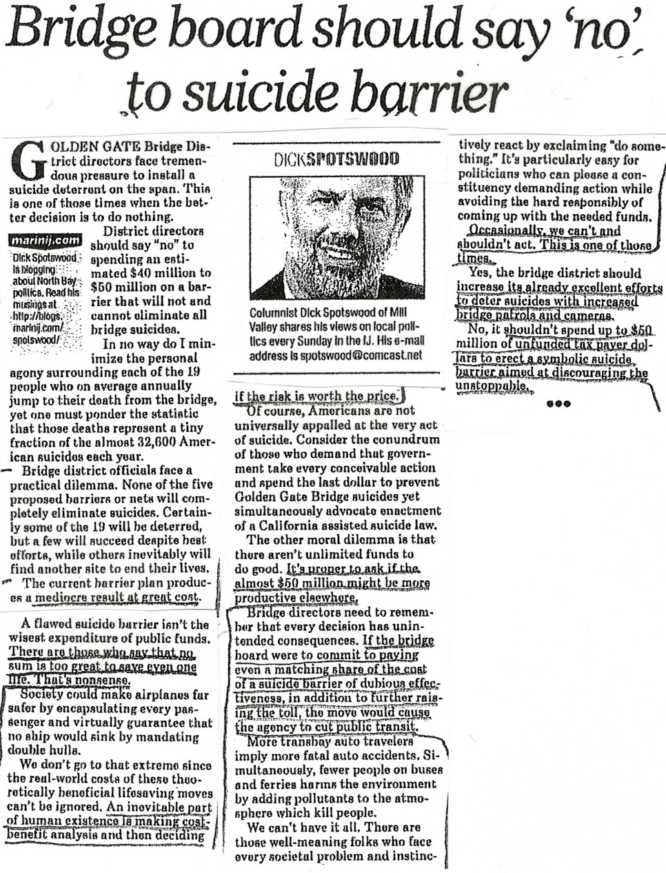 This is a typical example of the anti-barrier sentiment expressed in the July 13, 2008 edition of the Marin Independent Journal.