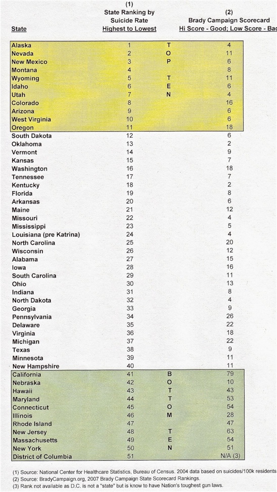 *Means restriction is cited by experts as an effective deterrent to suicide. More suicides in the US are by gunshot than by any other means. Seventeen published studies show the rate of suicide death in gun-owning households is at least three times greater than in households where guns are not present. To illustrate, note that states with lax gun laws have the highest suicide rates, and vice versa.
